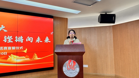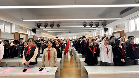 2026年4月10日下午,“领巾飘扬承薪火 铭言铿锵向未来”初一年级铭言宣誓仪式在复兴校区庄严举行。全体初一年级少先队员佩戴鲜艳的红领巾,在队旗下郑重许下青春誓言,以仪式感唤醒责任感,以铭言精神照亮成长之路。伴随着激昂的出旗曲,中国少年先锋队队旗缓缓入场,全体队员肃立敬礼,目光追随那一抹鲜红。随后,全场高唱《中国少年先锋队队歌》,嘹亮的歌声回荡在会场,唱出了新时代少先队员的精神风貌。