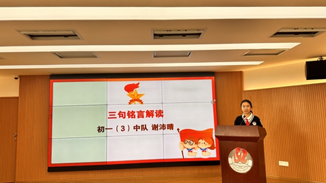 随后,大队委员谢沛晴队员结合自己在大队部的亲身经历,分享了对于三句铭言的理解。“责任不分大小,把每一件小事做好,就是在为祖国、为家乡尽责任”“互助让校园充满温度”“困难不是绊脚石,而是成长的阶梯”……朴实话语中蕴含着真切感悟,赢得了在场队员的共鸣。